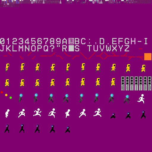 Up until that point, I only worked with full-screen quads and pixel shaders, so I needed to add support for sprites. The usual way to achieve this is by collecting all the sprites together in a single texture, called a texture atlas. And then to draw a single sprite, to create a quad with XY coordinates placing it in the correct on-screen location and UV coordinates selecting the correct area of the atlas. Here's the atlas for The Metastructure: