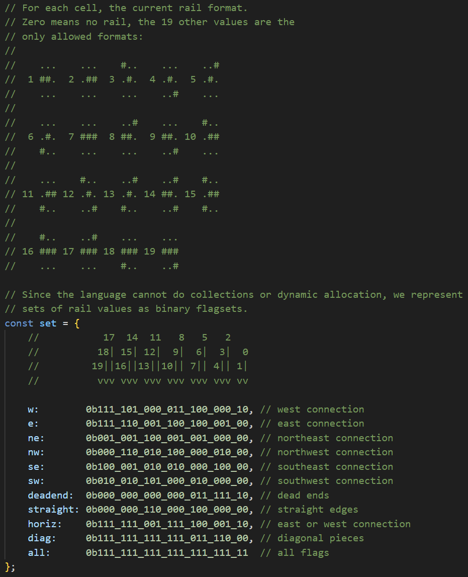 Every moving entity has its own code for following the rail (agent.ts, for example), but all of the rail generation, and the helper functions, are in rail.ts. In particular, since neither structs nor data structures are supported, I had to resort to bitwise operations and store information in bits instead: