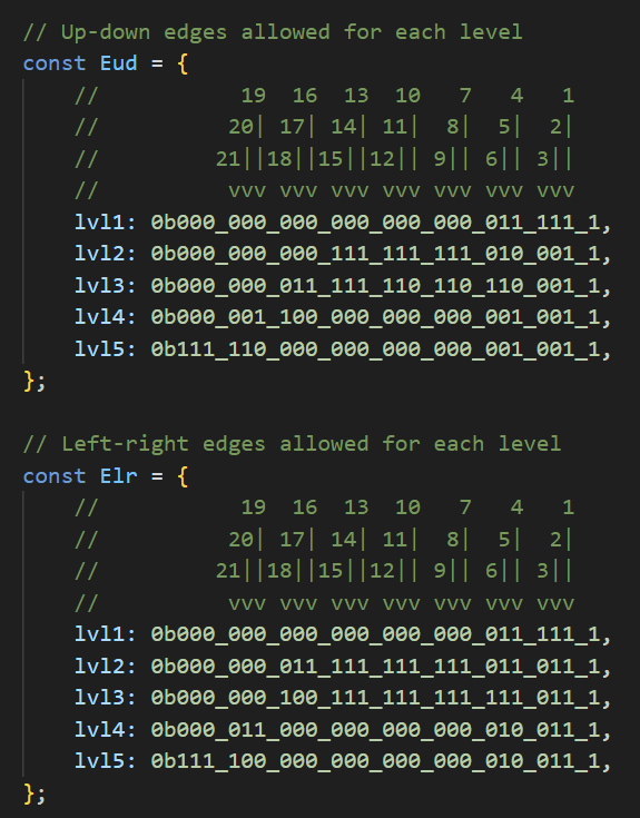This algorithm takes up the first 480 lines of tiles.ts. Since the language has no structs, the information of which neighbours should have which edges is instead stored in an int32 using bit shifts: