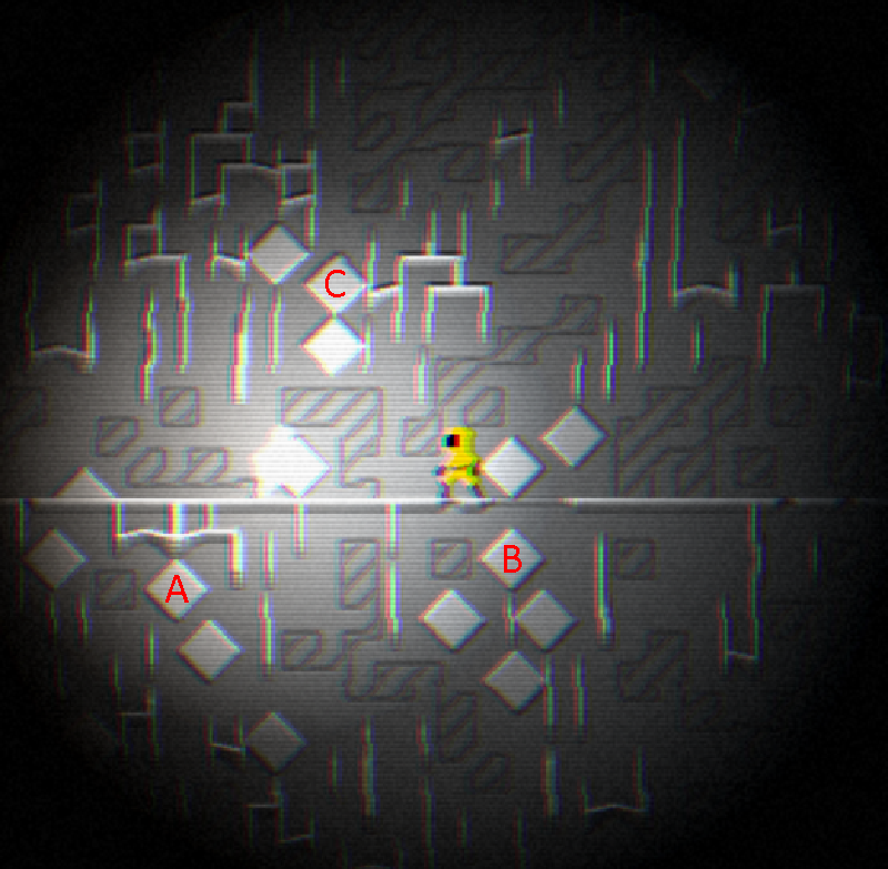 In the image above, diamond A is lit from the top right, diamond B is lit from the top left, and diamond C is lit by two light sources, one from the bottom left and the other from the bottom light.