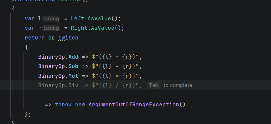 Visual Studio 2022 was mostly able to suggest trivial things, like assigning constructor parameters to fields with the same name, or auto-applying an edit after manually performing it a few times. Rider suggests completions that truly make semantic sense, like mapping the operator / to an enum value BinaryOp.Div. And it's not limited to C#, either: I was surprised to see it suggest valid JavaScript/WebGL code, inside of a C# string literal, and with the GL. prefix I needed on top, while properly applying the meaning of "additive". The last three lines in the example below were suggested by Rider: