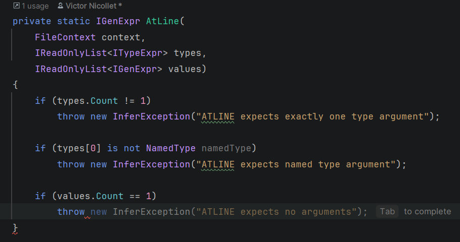 It's also fairly good at producing documentation, and it emits correct exception messages based on the conditions that led to the exception being thrown. This has saved me on multiple occasions, where my condition was wrong and I only noticed when the exception message didn't match my expectation. For example, ATLINE should expect exactly one argument, but I mistyped == 1 instead of != 1 and the suggested exception message was: