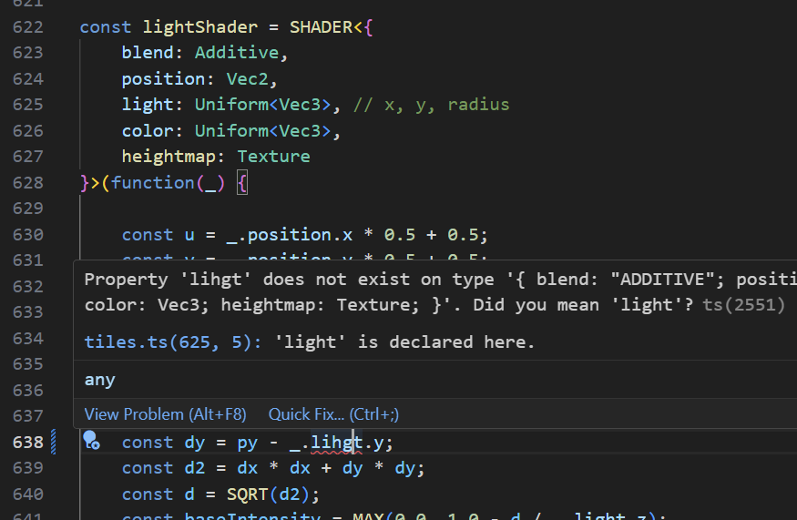 But why pick TypeScript? Why not have TSGL pretend to be C# code, or OCaml? Because TypeScript lets me configure the behavior of its type system so that errors in TSGL code are reported properly. Of course, TypeScript doesn't advertise the feature as configuring the type system, but what matters is that you can create a global.d.ts file that uses TypeScript's very expressive type system to annotate TSGL constructs. The reason why that type system is so good at describing the weird behavior of an external function, is because it was designed to annotate code written in JavaScript that didn't care about types at all.
